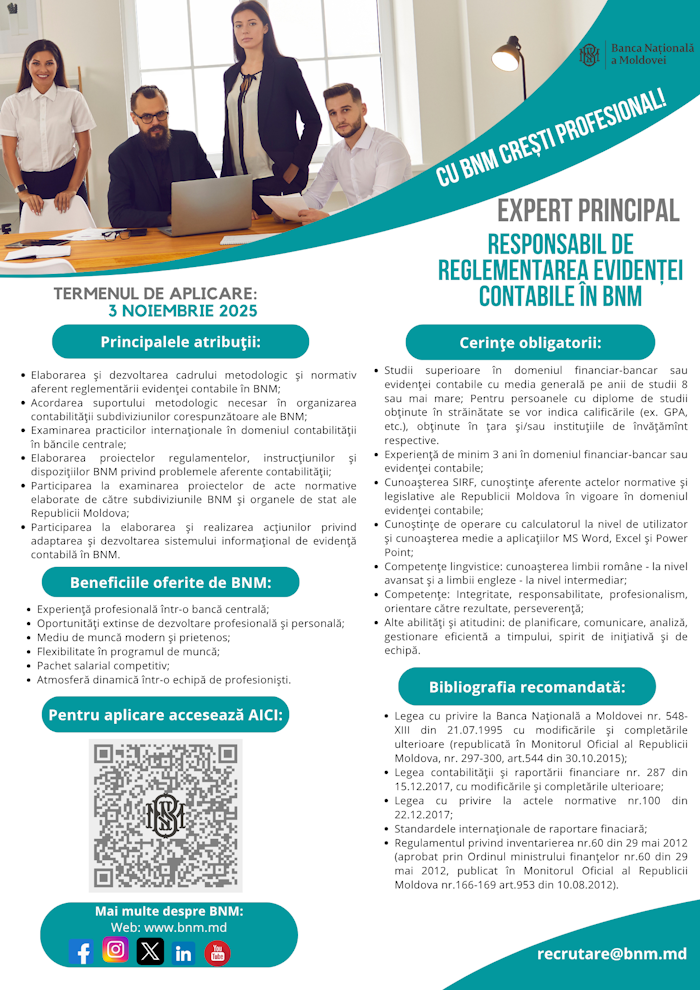 Expert principal responsabil de reglementarea evidenței contabile în BNM